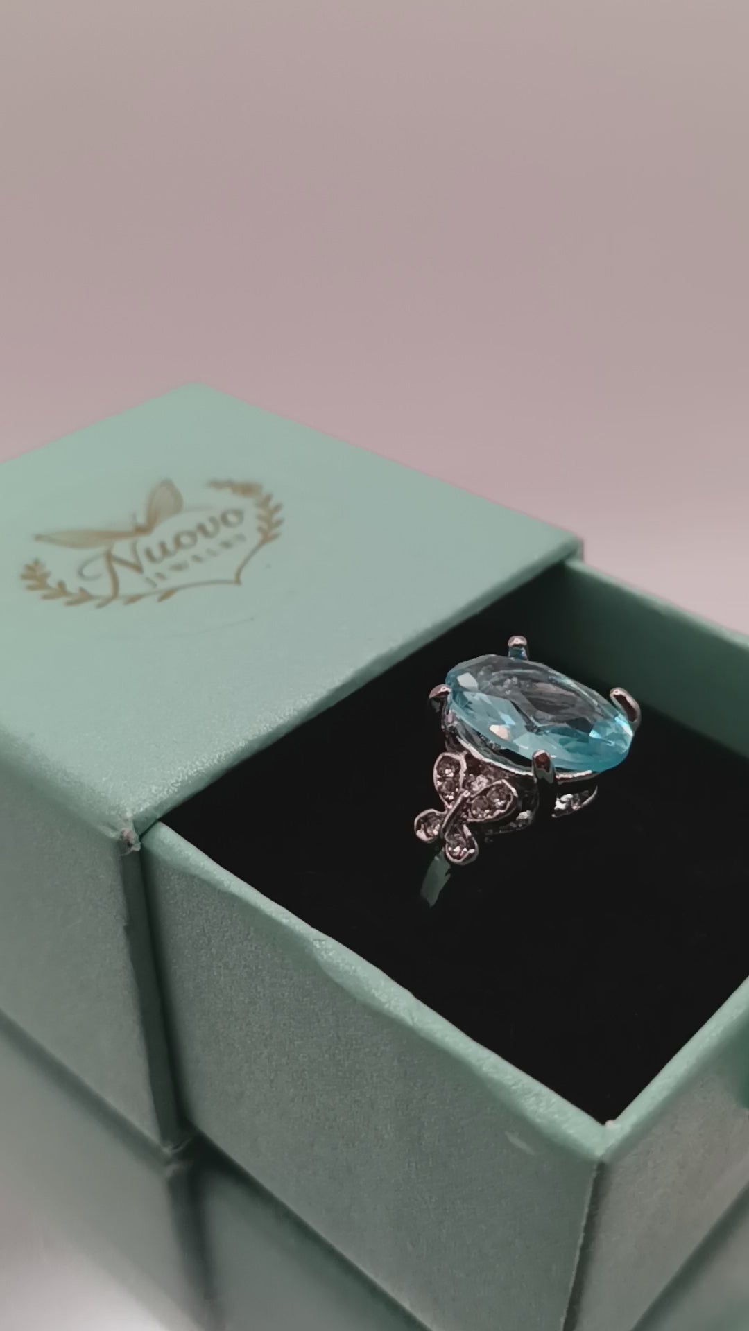 Ein atemberaubender Modering aus silberplattiertem Edelstahl mit einem großen, ovalen Zirkon in zartem Ozeanblau und funkelnden, klaren Zirkonen an den Seiten für zusätzlichen Glanz. Ein Schmuckstück, das jedem Look Eleganz und Frische verleiht. Gewicht: 4,3 g